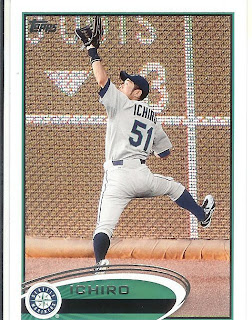 I'm looking at the "name plate", for lack of a better term, and think, Oh look, an error, no last name. So after a little research, I see that the 2012 Ichiro Topps out there, don't have a last name. As I write this, I'm looking at his uniform, and the back says ICHIRO, shouldn't it say SUZUKI? After all, it is his last name.